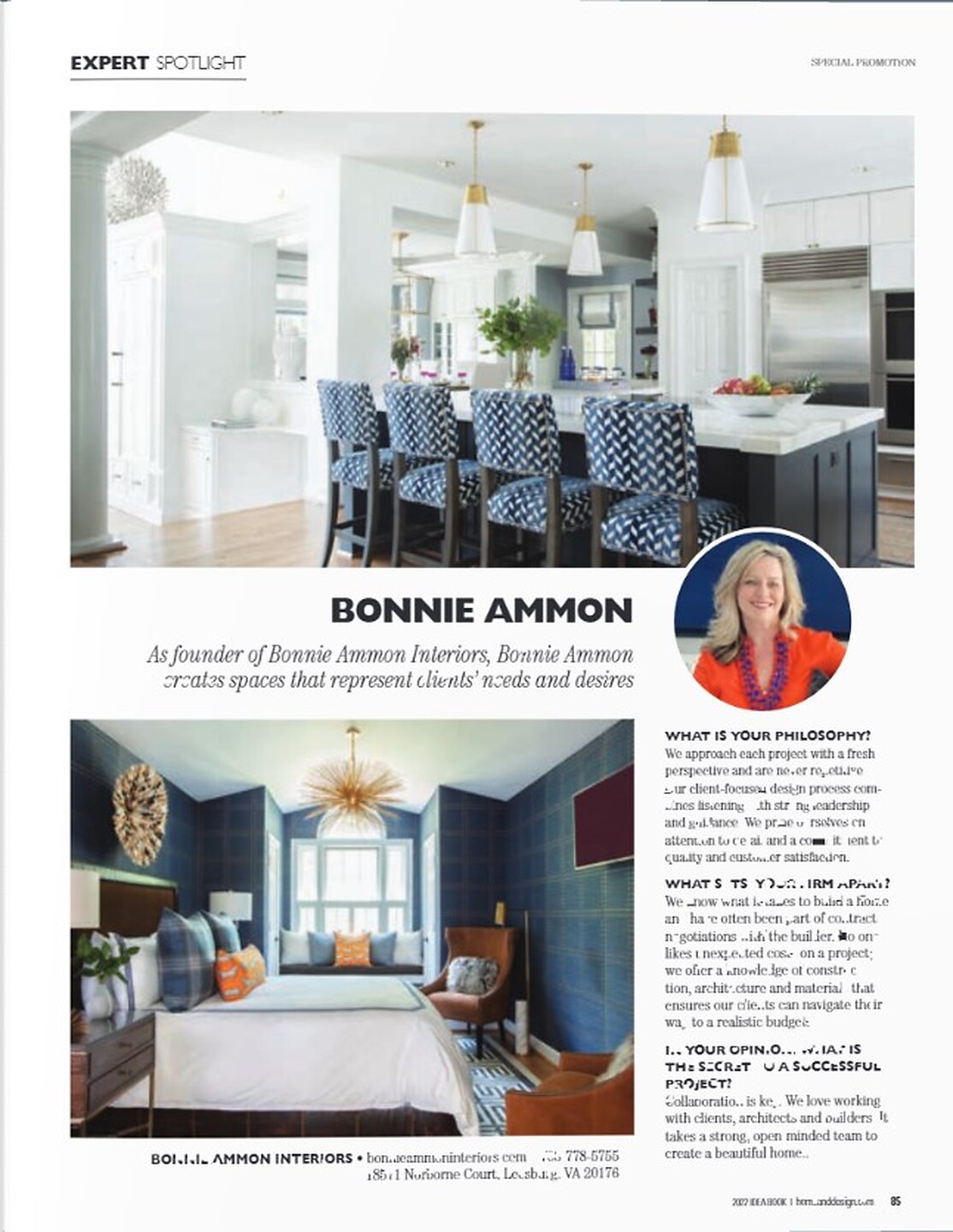 In the article "Interior Experts" interior designer Bonnie Ammon featured Rivets 5700 Gold on Navy Manila Hemp in the guest bedroom of a clients home.