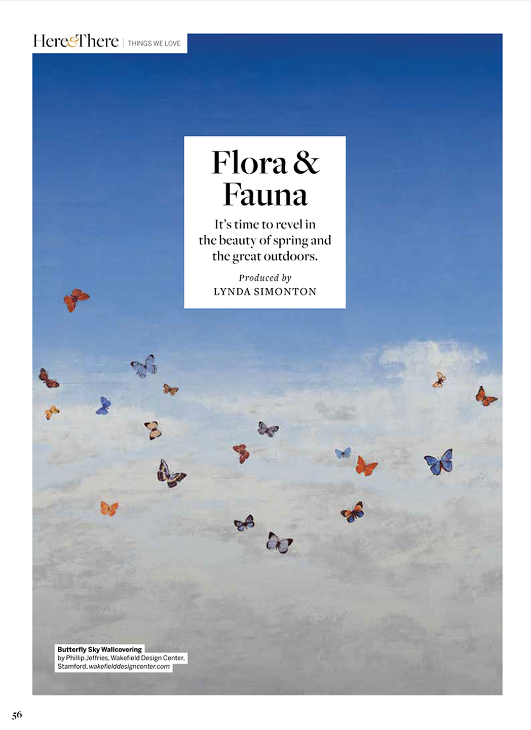 In article, "Flora and Fauna," Butterfly Sky 9669 Blue Morpho on Supernova White Star Dust Silk is featured on the opener page of a spring & outdoor product feature.