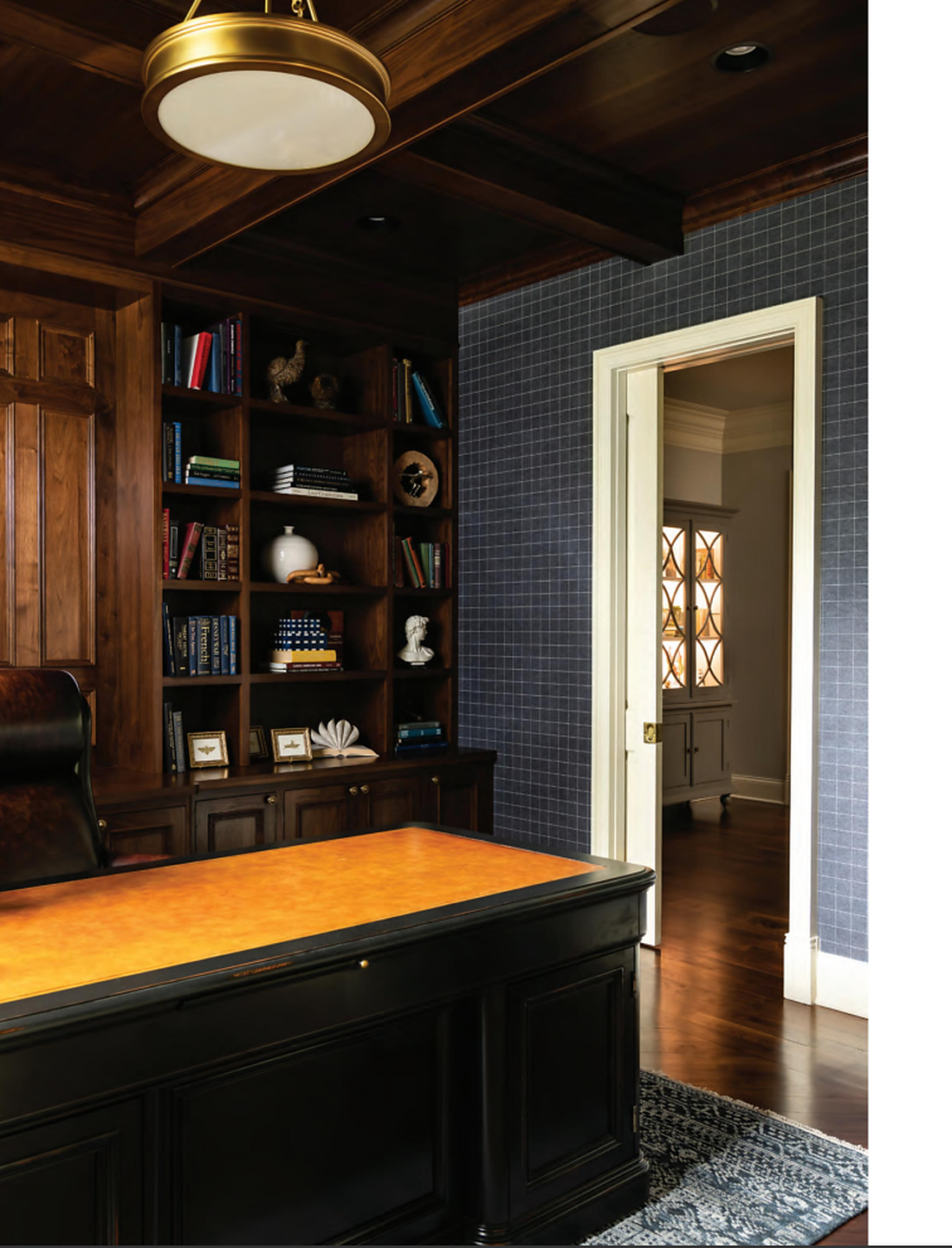 In article, "Gathering Place," interior designer Sandra Merritt featured Savile Suiting Plaid 4474 White on Navy in the study of a client's home.