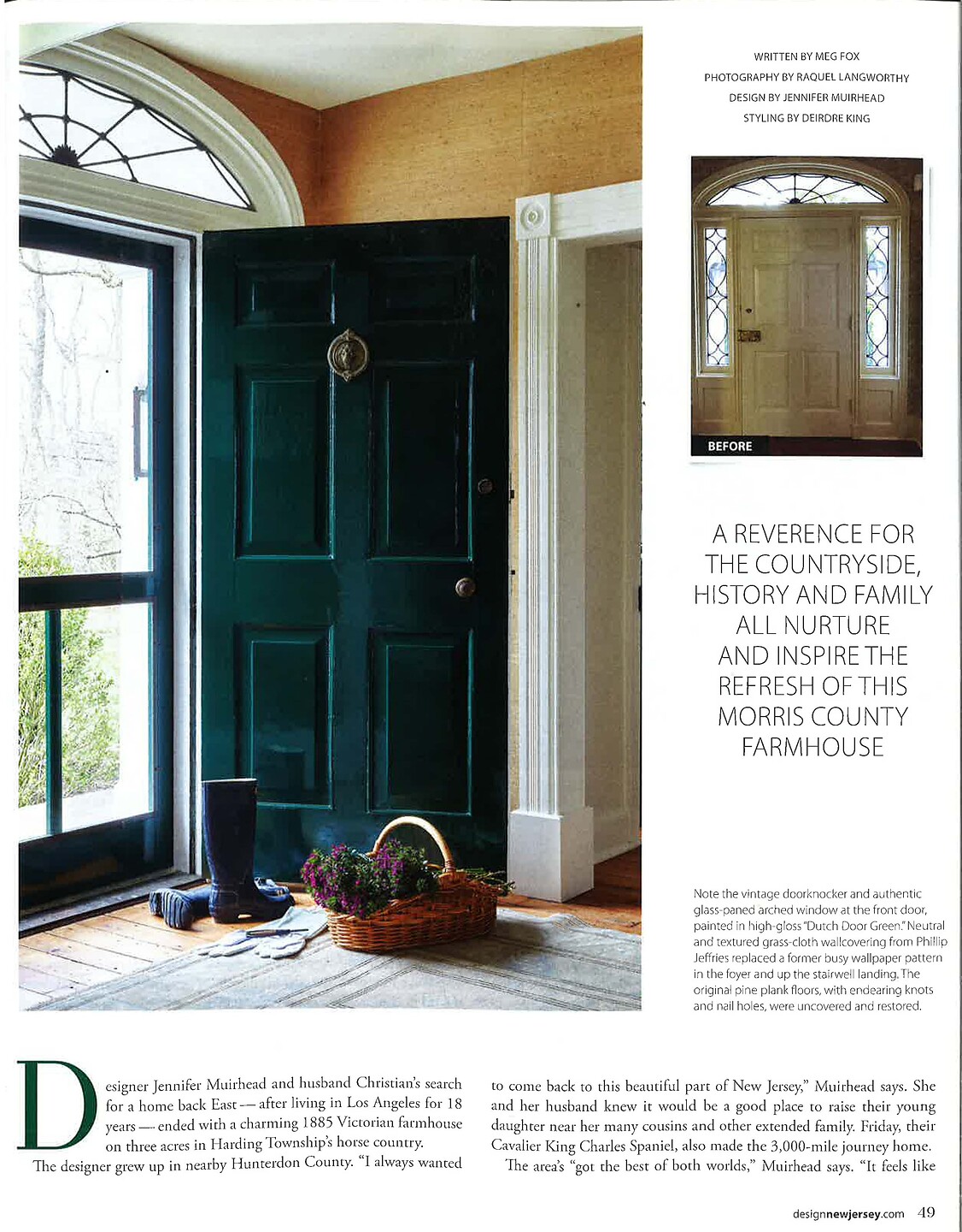 In article "Old House, New Story," designer Jennifer Muirhead featured Juicy Jute 1977 Spring Flax in her farmhouse foyer.