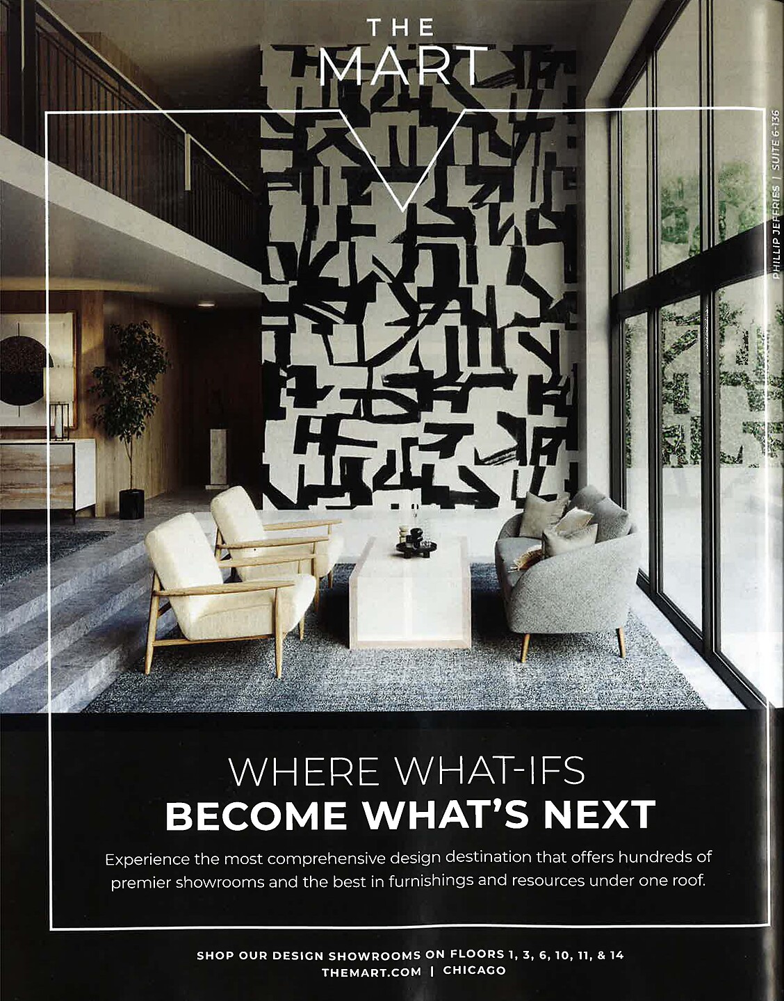 In The Mart's Interior Design ad, Phillip Jeffries' Offset 9135 Black Ink on White Dove Woven Walls in Chicago Suite 6-136 was featured.