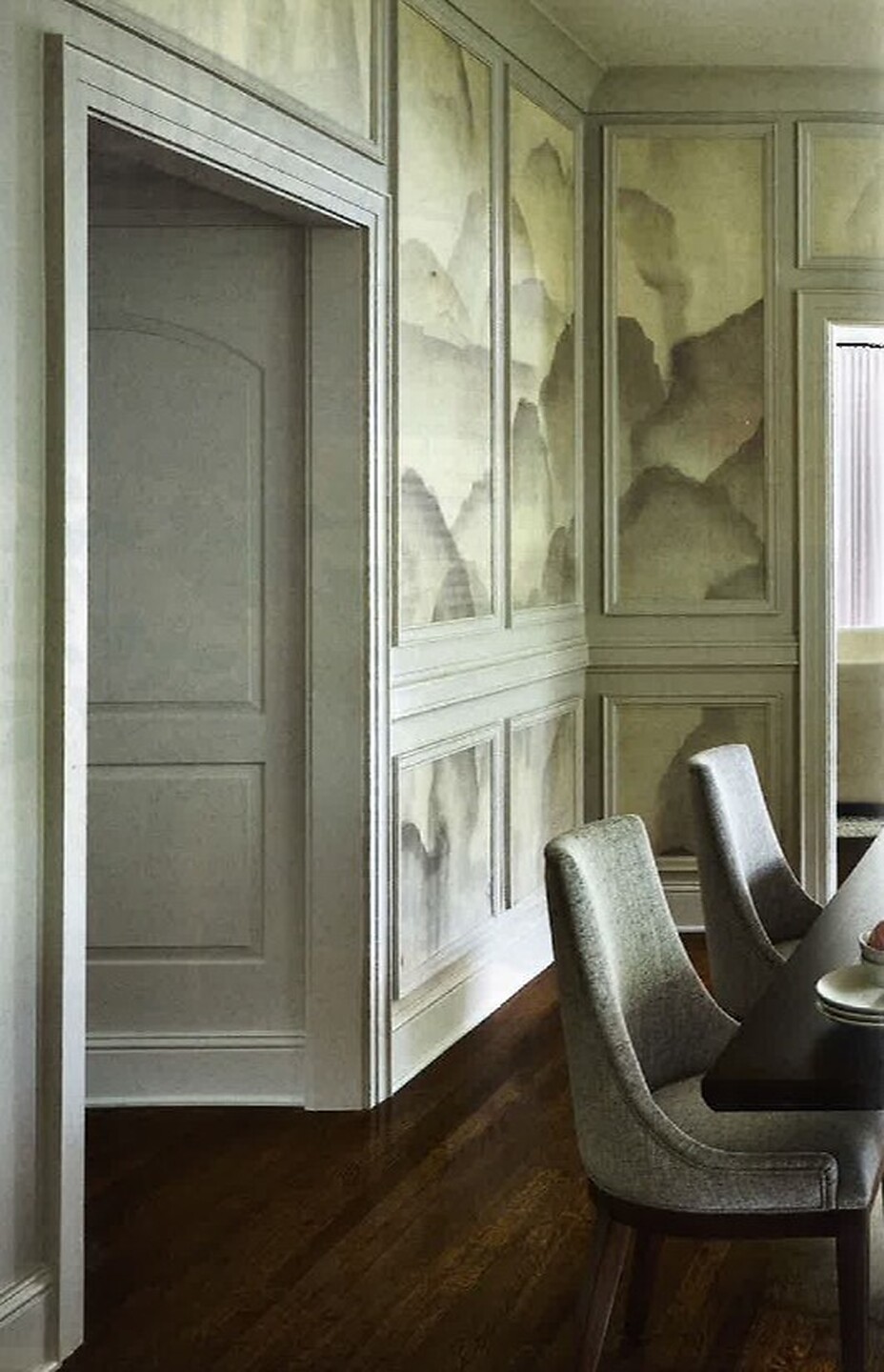 In article, "Relaxed Refinement," interior designer Hayley Kauffmann of Hayley Maureen featured Mist 4794 Whisper in the dining room and Arboretum 5581 Dawn on Once Upon A Grey Vinyl Mirror Mirror in the lounge of a client's home.