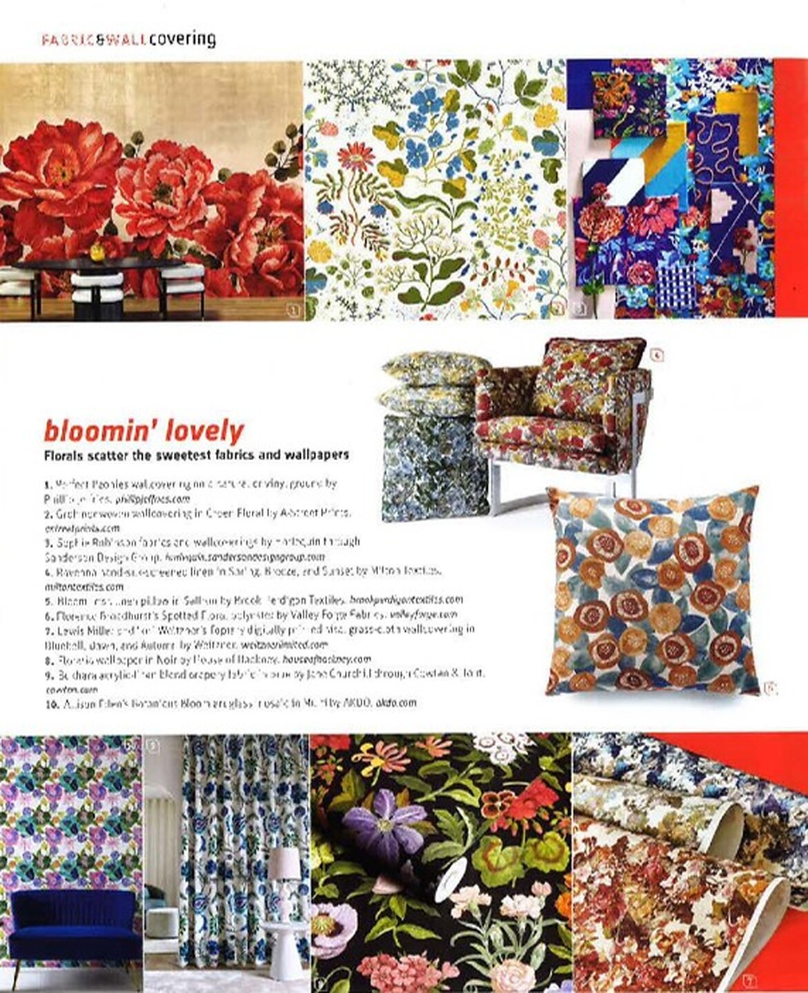 In article,"Bloomin' Lovely," Perfect Peonies 10173 is featured among fabrics and wallcoverings inspired by sweet florals.