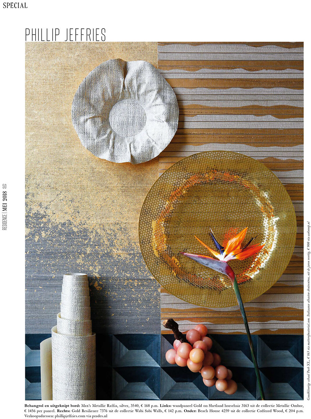 In article, "Phillip Jeffries," Max's Metallic Raffia 3540 Silver, Metallic Ombre 3163 Gold on Shetland Horsehair, Wabi Walls 7376 Gold Resilence, and Coffered Wood 4259 Beach House were featured in a design spotlight.