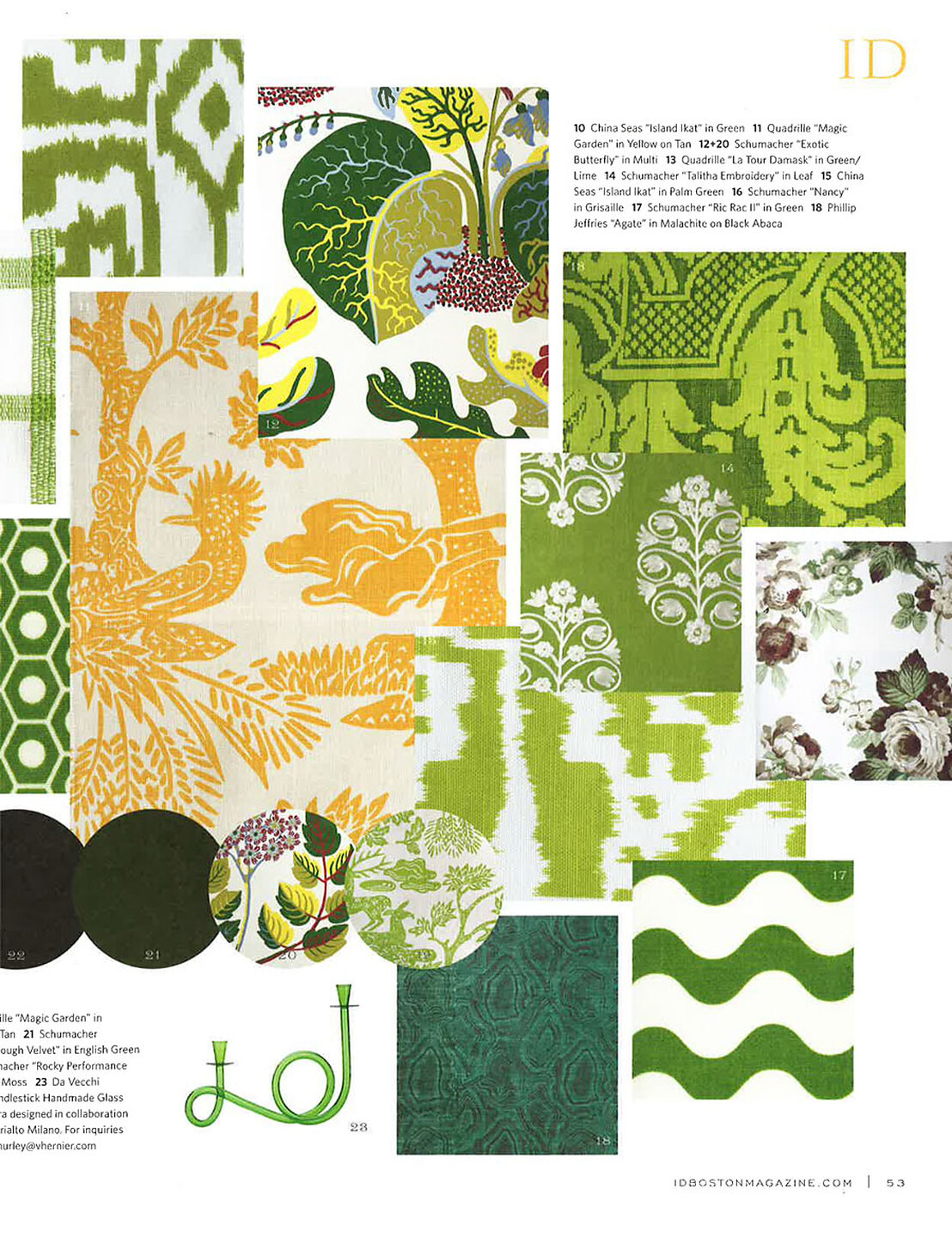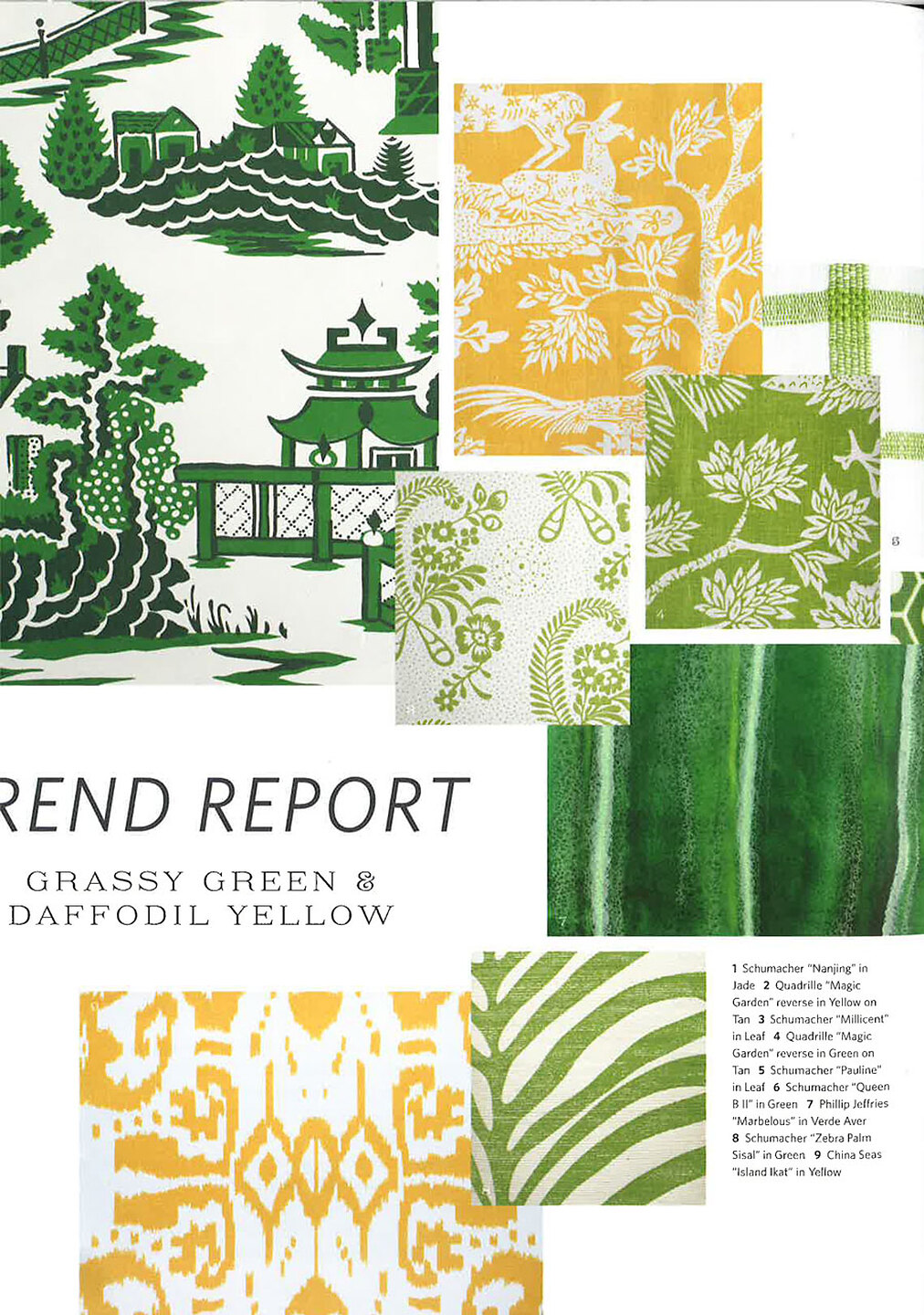 In article, "Trend Report," product shots of Marbleous 5965 Verde Aver and Agate 5937 Malachite are featured in a trend report for greens.